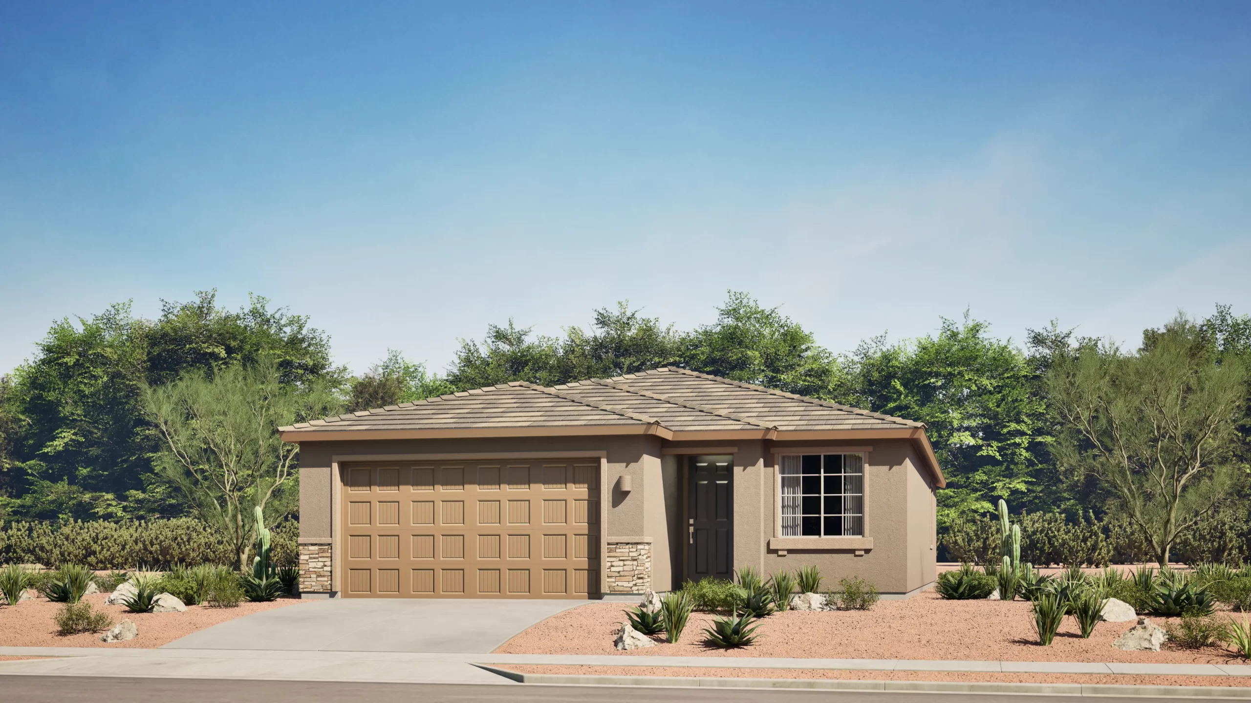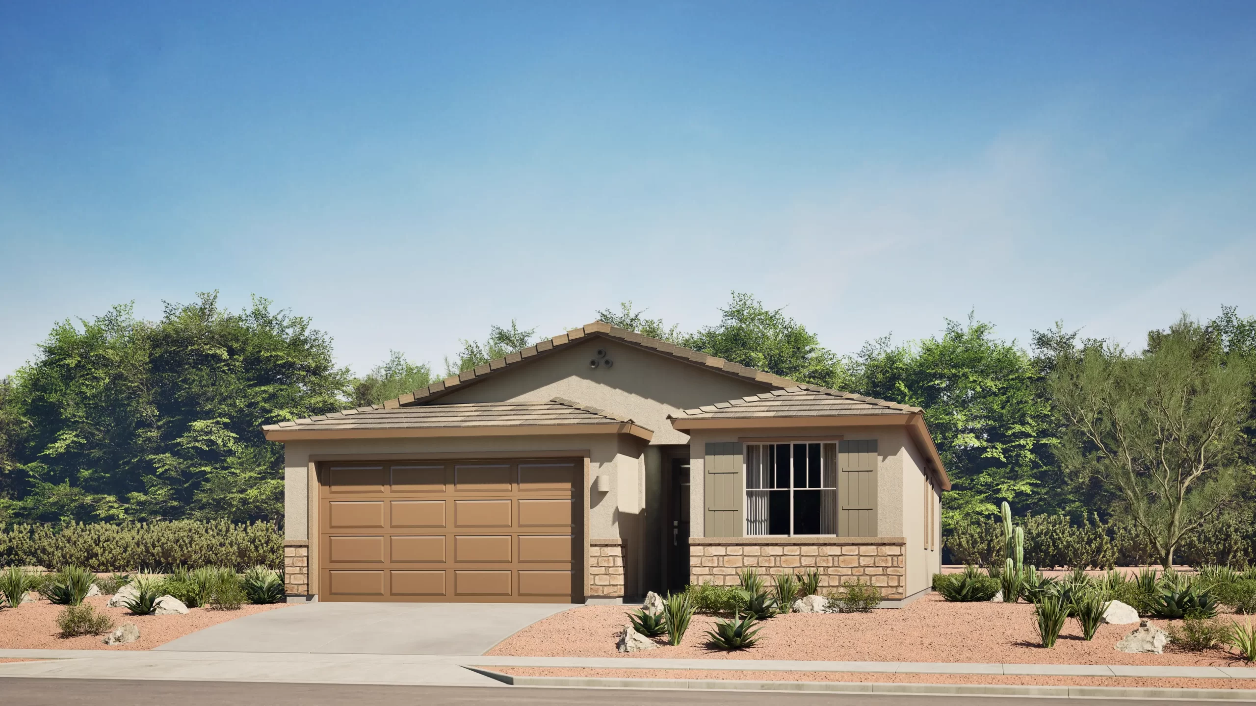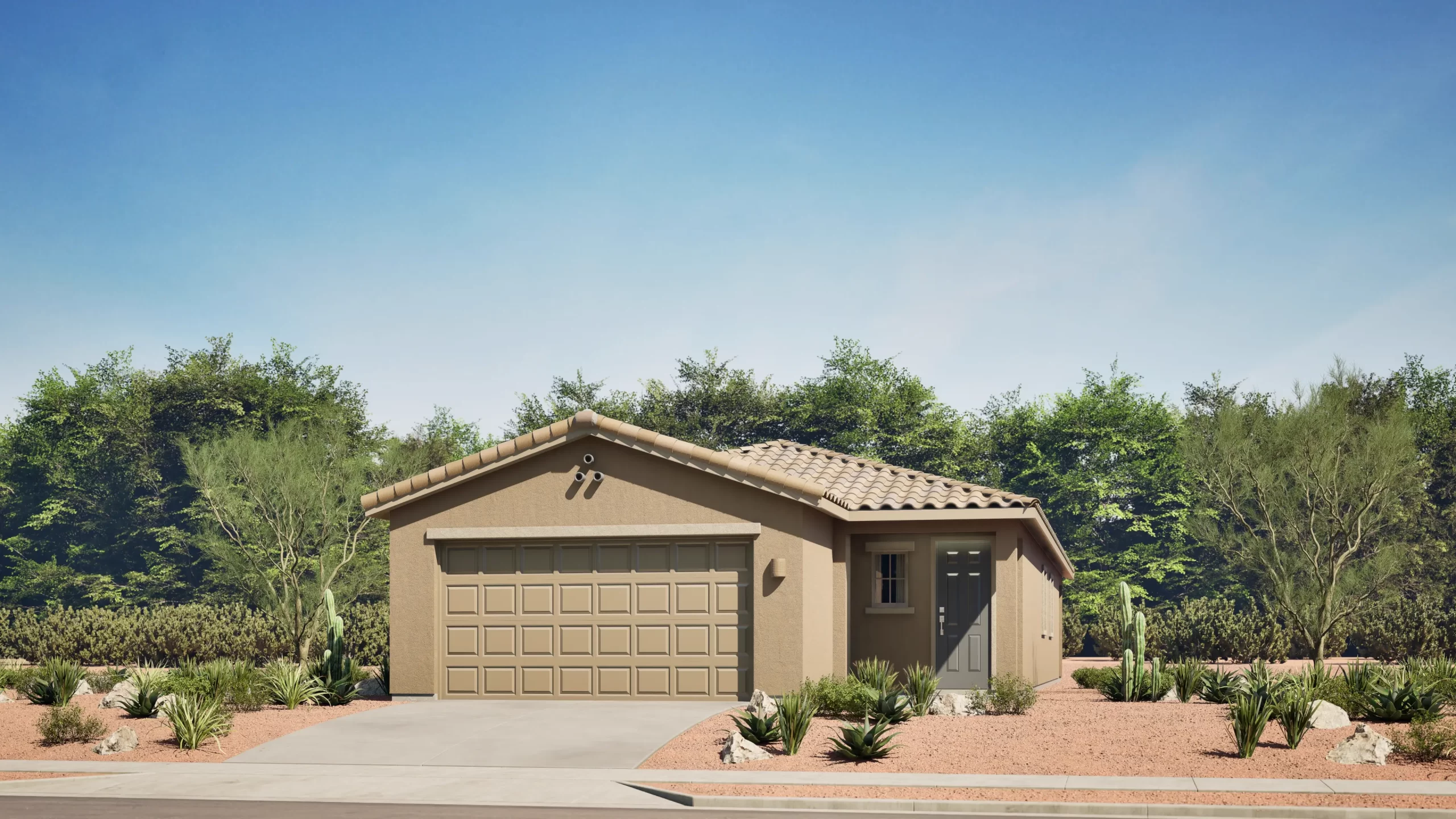 This thoughtfully designed single-story home centers around an expansive great room, dining area, and kitchen that open directly to a large covered patio — perfect for Arizona outdoor living. The owner's suite is privately located at the rear of the home and features a generous walk-in closet and full bath. Two additional bedrooms share a second bathroom near the entry. A two-bay garage completes the home.