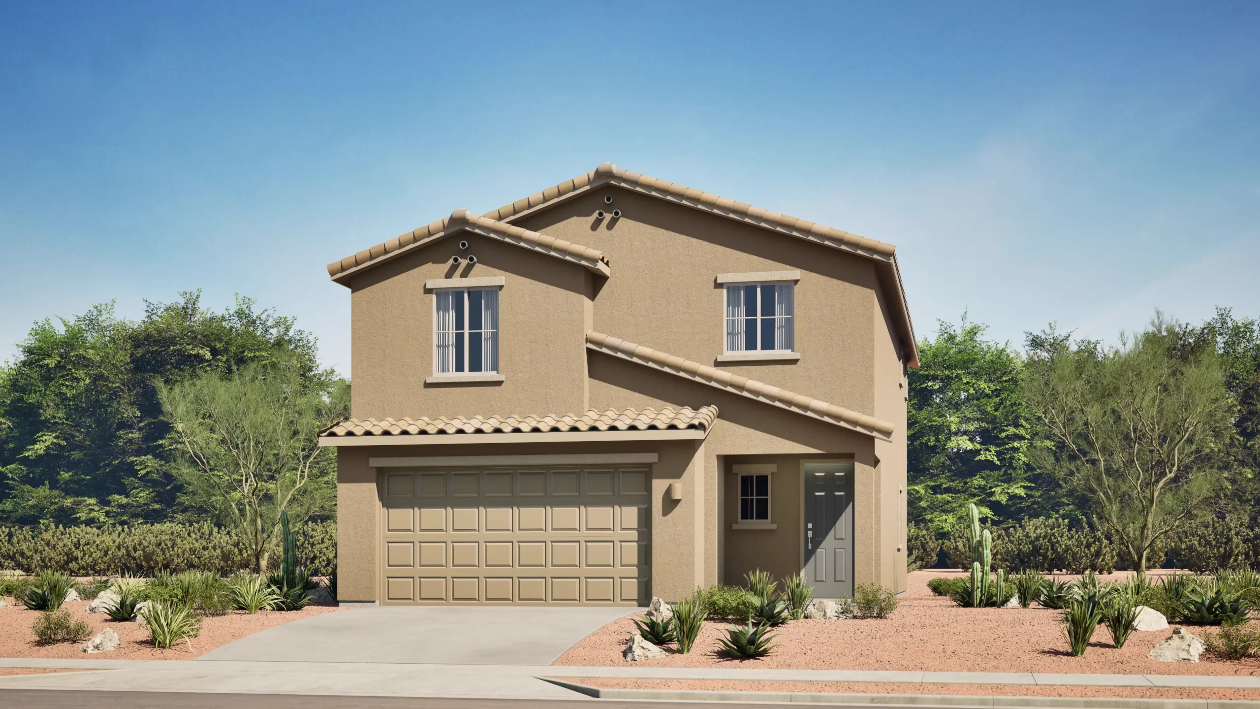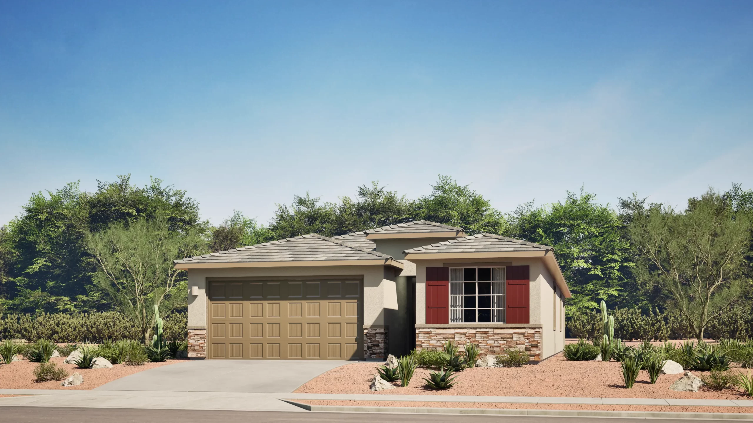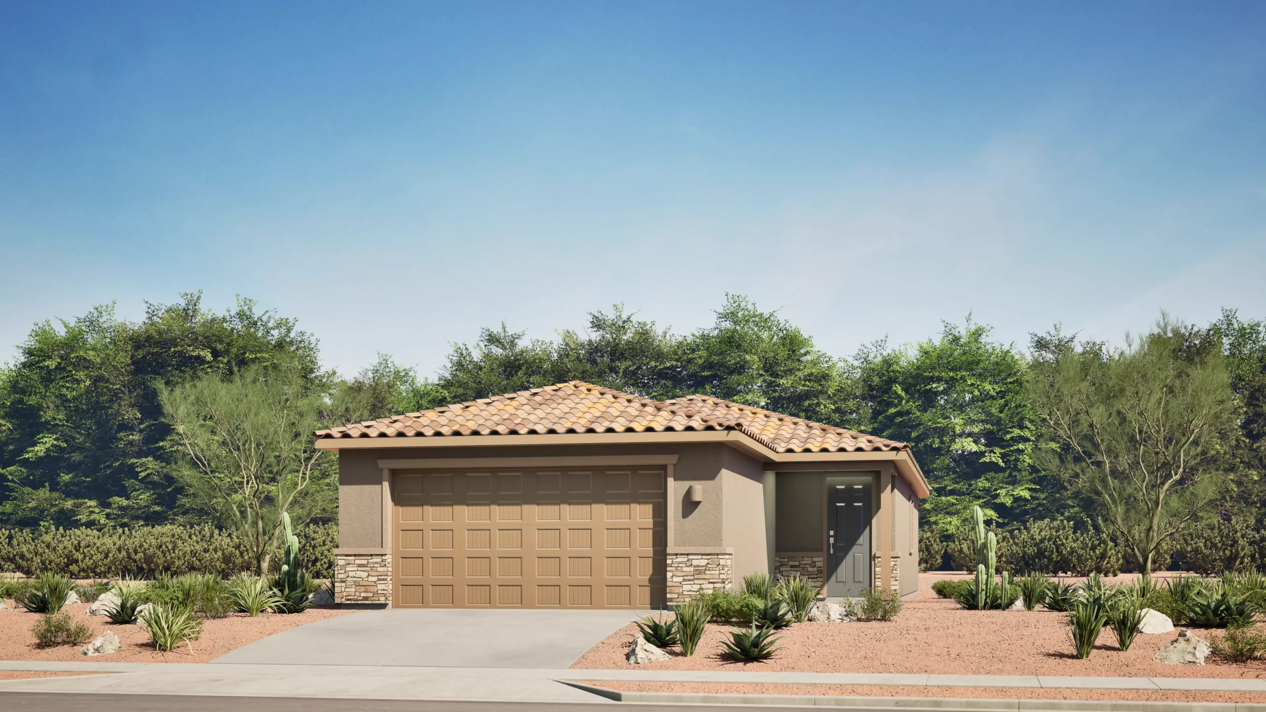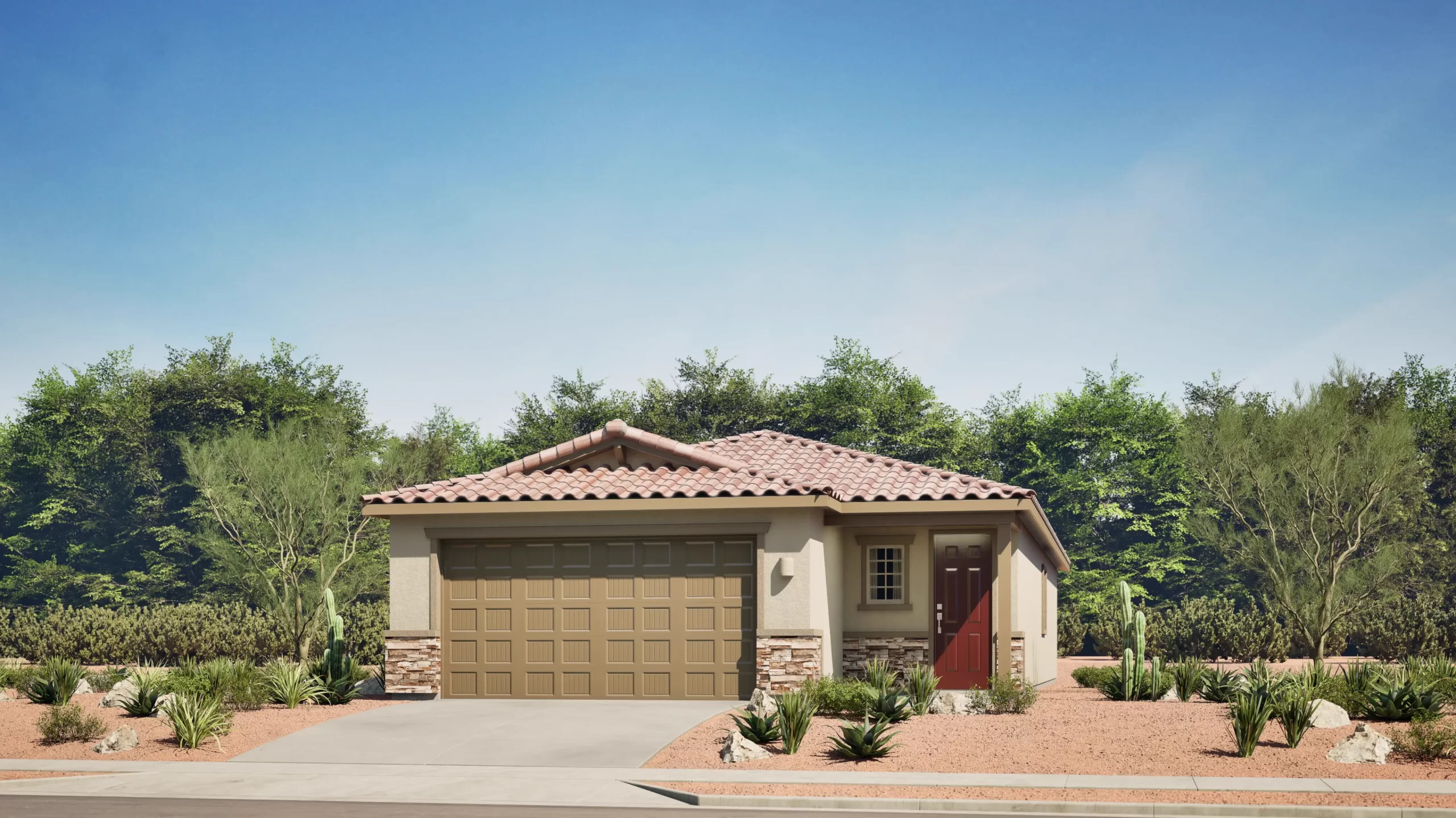 This thoughtfully designed single-story home centers around an expansive great room, dining area, and kitchen that open directly to a large covered patio — perfect for Arizona outdoor living. The owner's suite is privately located at the rear of the home and features a generous walk-in closet and full bath. Two additional bedrooms share a second bathroom near the entry. A two-bay garage completes the home.